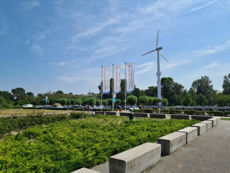 De windmolen bij het parkeerterrein staat er toevallig en hoort niet bij het zwembad. De windturbine levert dus geen stroom aan onze faciliteiten.